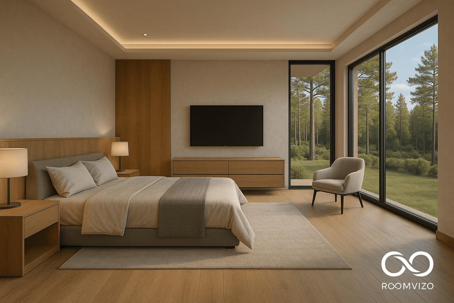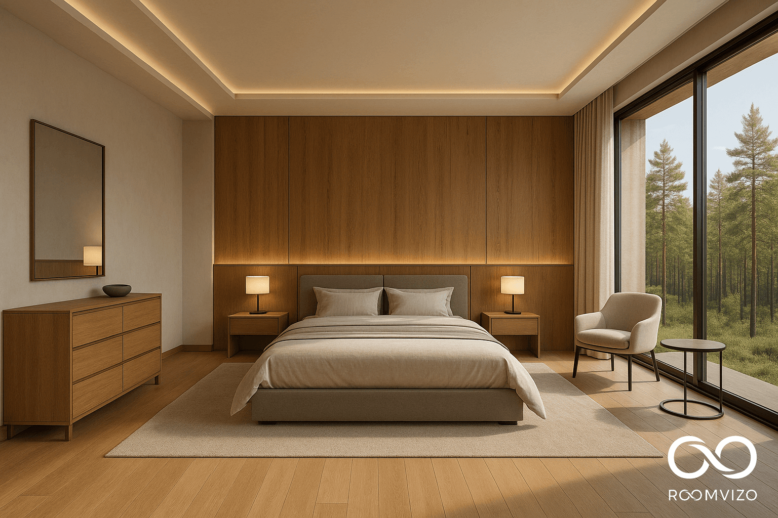 A calming retreat designed with simplicity and softness in mind. The wooden bedframe, in natural grain oak, is layered with plush bedding in hushed shades of cream, sage, and muted blue. Linen throws and handwoven pillows invite relaxation, while subtle accents and warm lighting turn the room into a personal haven.
