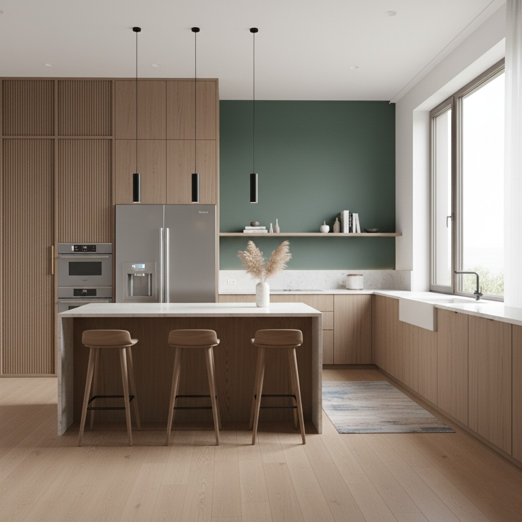 The material identity of the Urban Oasis is defined by a blend of sleek and tactile surfaces. Fluted wood paneling is a recurring theme, adding a dynamic, textured element to walls and cabinetry. Smooth, matte finishes on surfaces and furniture provide a clean contrast. The textiles include cozy wool throws and soft linens, while hard surfaces are expressed through minimalist ceramics and a touch of brushed metal detailing, creating a layered and sensory experience.