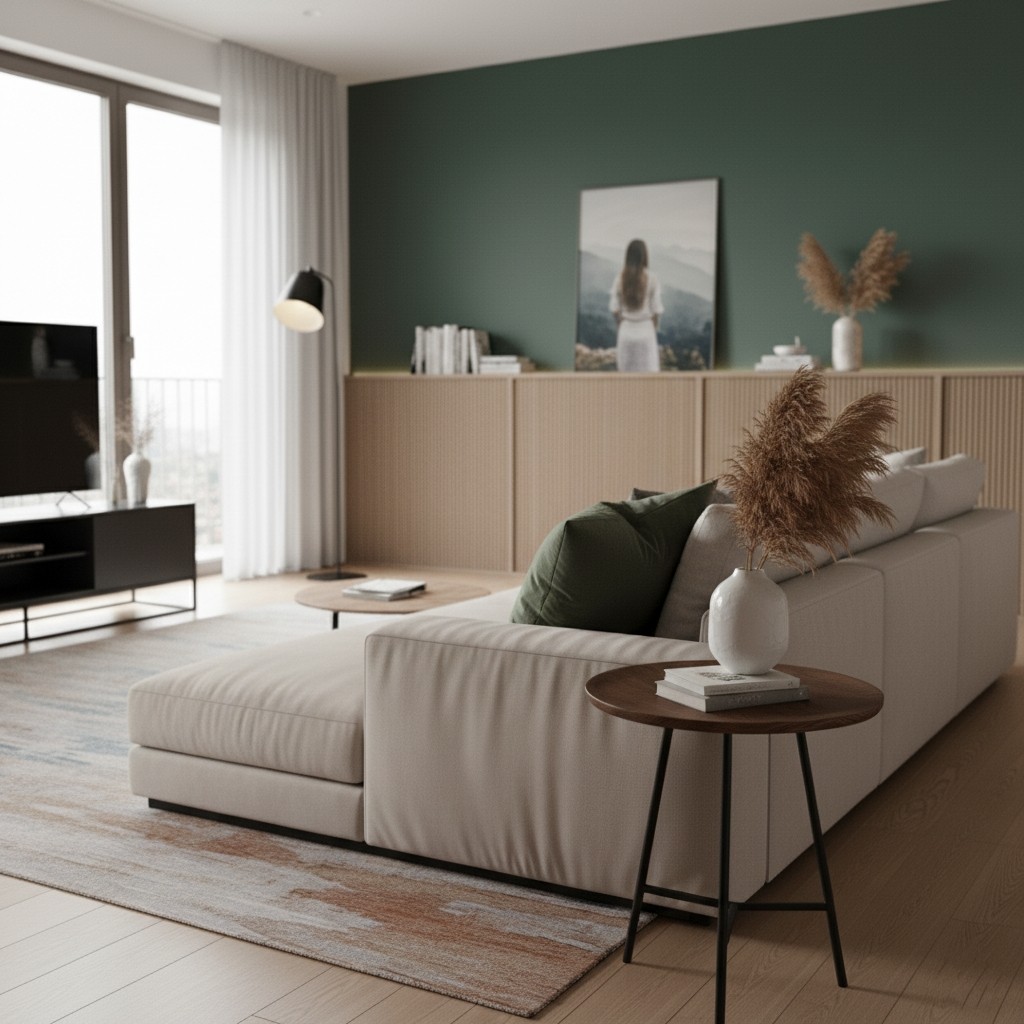 A sleek, modern gathering space defined by its bold accent wall and clean-lined furniture. A low-profile sofa in a neutral tone provides a canvas for plush green and gray pillows. The expansive windows offer a connection to the outdoors, while the media console and cabinetry, with their minimalist design and fluted wood details, add a layer of quiet sophistication. It's a room designed for both relaxation and lively conversations.