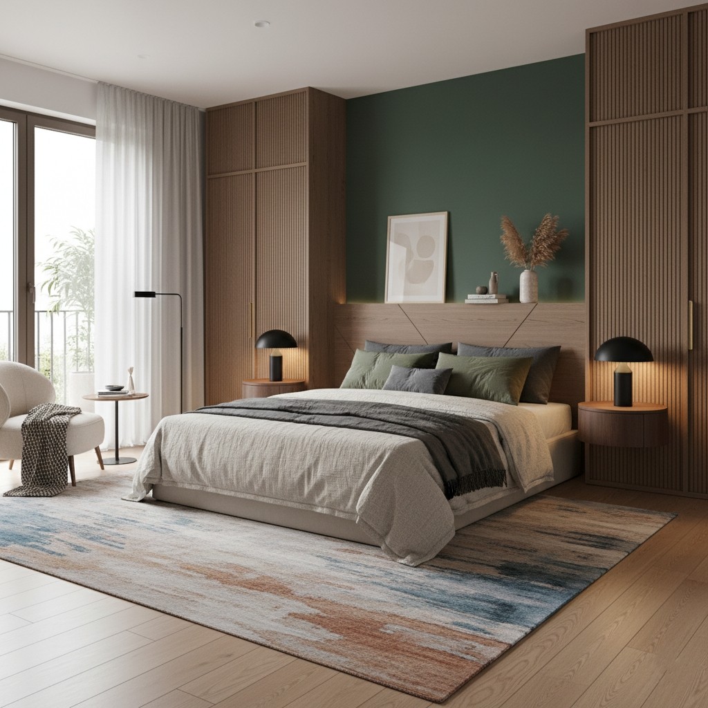 A calming retreat that marries bold color with subtle texture. The deep green feature wall creates a dramatic backdrop for the headboard, which is crafted from natural wood with a geometric design. The bed is dressed in layers of soft linens in earthy tones of green, gray, and cream. Recessed and sculptural bedside lighting provides a warm glow, turning the space into a cozy and personal haven for rest and rejuvenation.